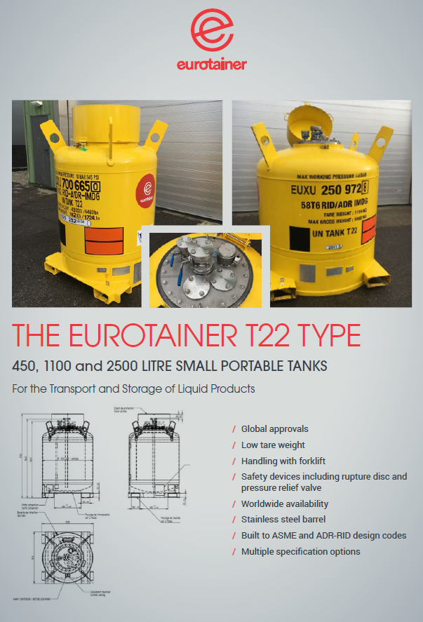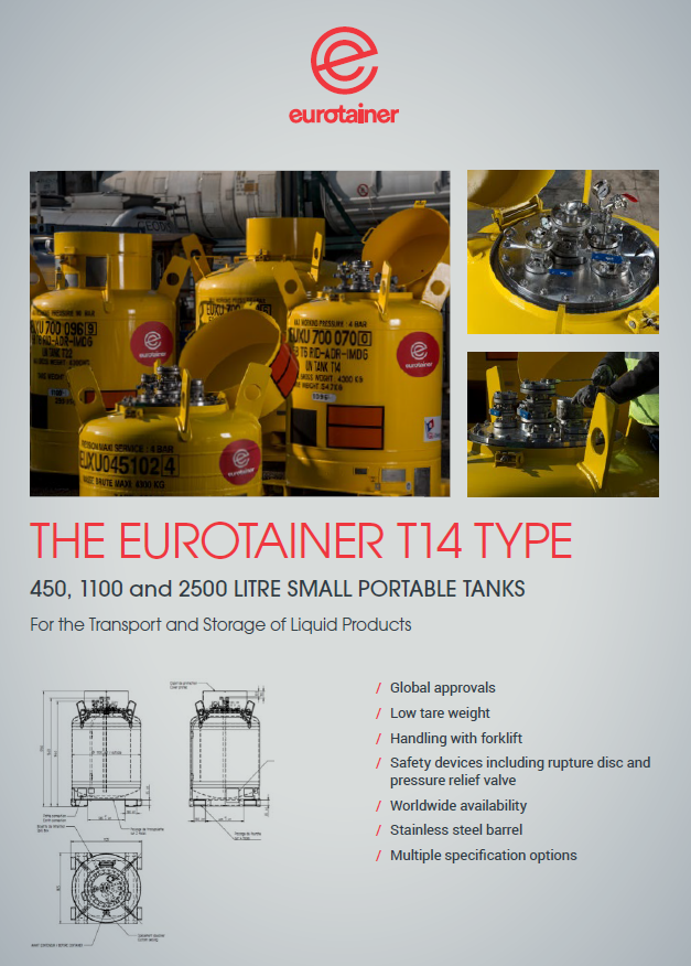 Un medio de transporte y almacenamiento versátil para pequeñas cantidades de líquidos. Los SPT para líquidos de Eurotainer están disponibles en una gama de capacidades de 450 litros a 25000 litros. Los depósitos de 450 litros suelen utilizarse para productos de gran pureza y los de 1100 y 2500 litros para productos básicos.